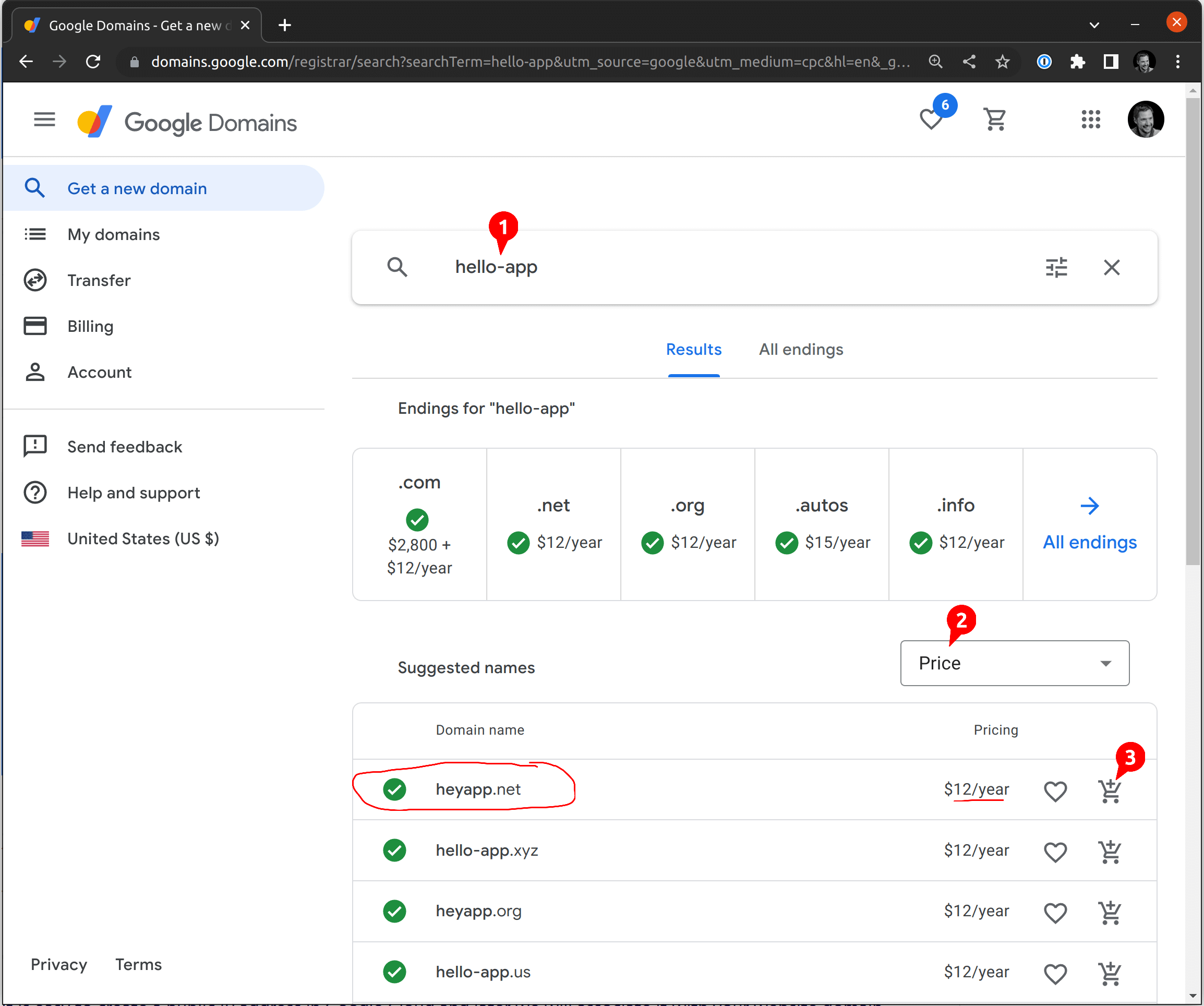 We will purchase a cheap domain name using a credit card. Go to https://domains.google.com, and type something in the search box. For the example, we searched for hello-app.com