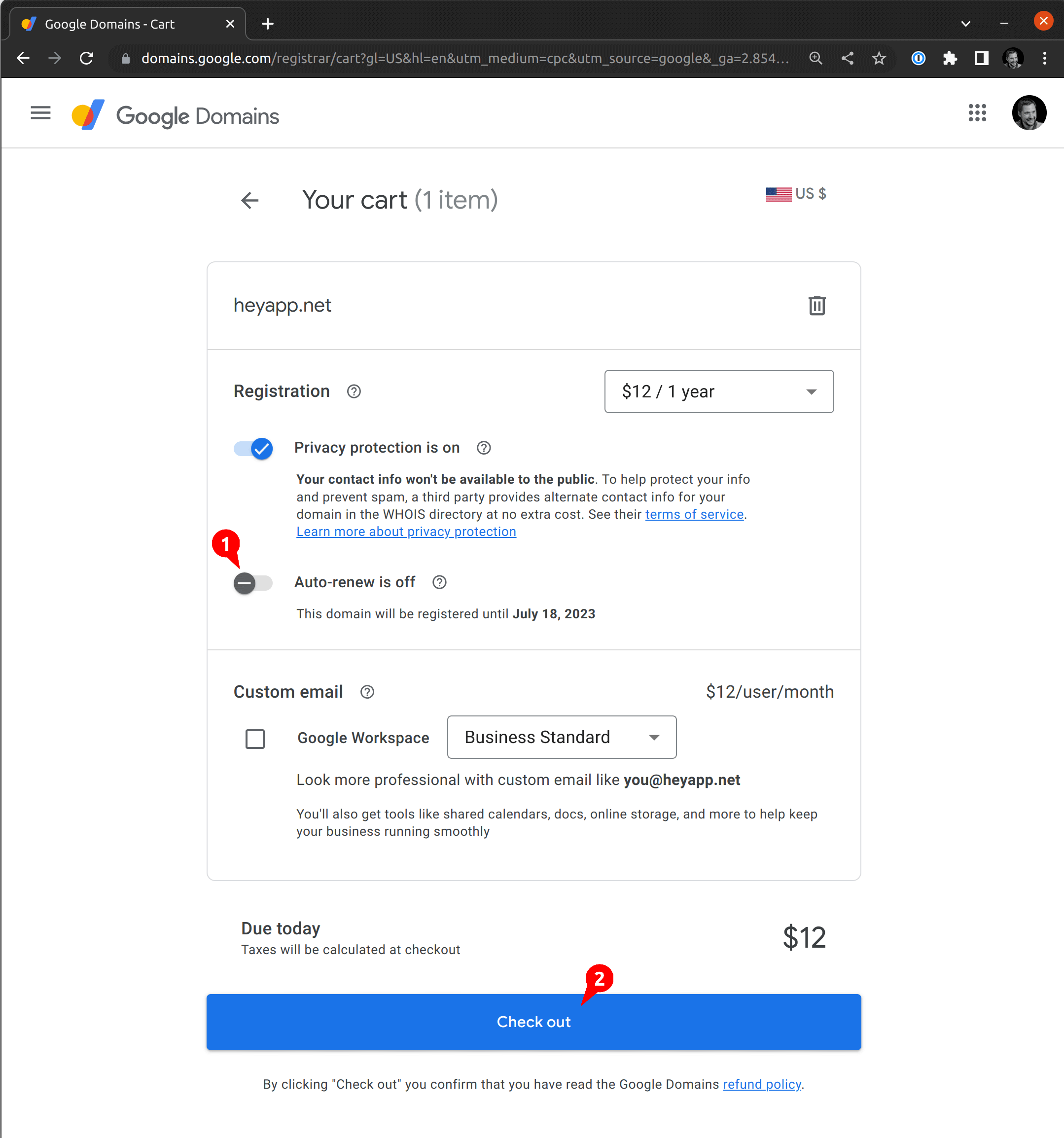 . It looks good! We then click the cart button. On the next screen, you will want to disable the auto-renewal, since we don't want to pay for this domain every year: